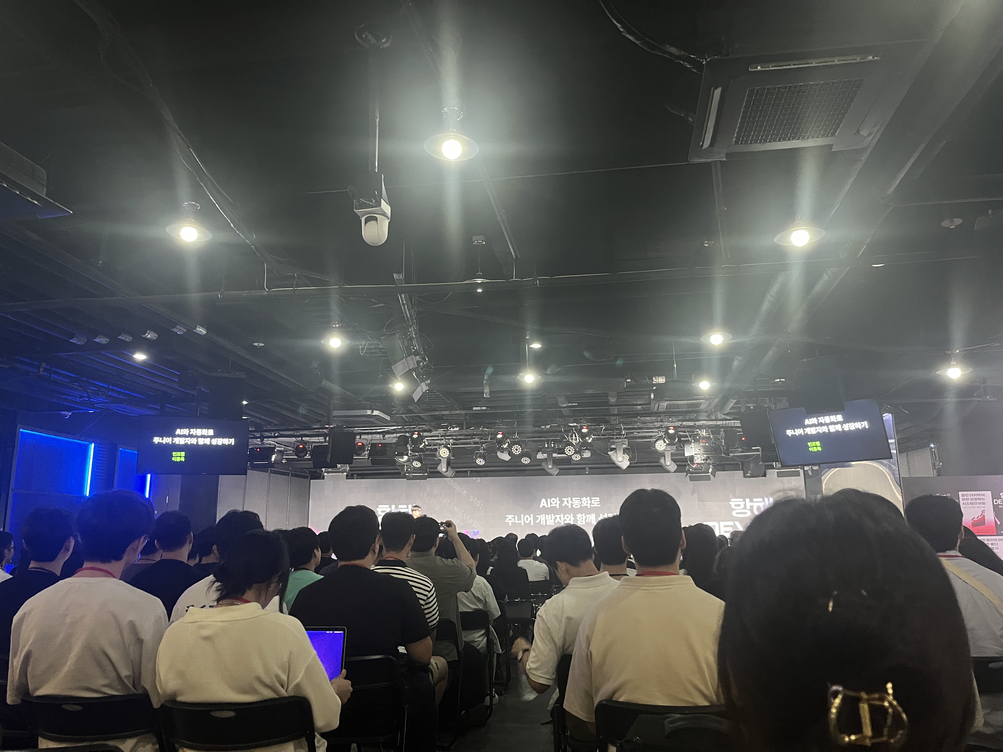 인프랩의 팀문화부터 먼저 설명을 시작해 주셨습니다. 우선 ai와 자동화로 주니어 개발자 키우기라는 발표에 앞서 이렇게 해야하는 팀 문화와 상황을 설명해주셨습니다. 인프랩에서는 사회생활을 처음으로 시작하는 어린 개발자들을 적극채용하고 있다고 합니다. 이런 개발자들을 빠르게 훈련시키고 실무에 투입시키기 위해 다양한 노력들을 하였고 그러한 노력의 결과물을 볼 수 있었습니다.